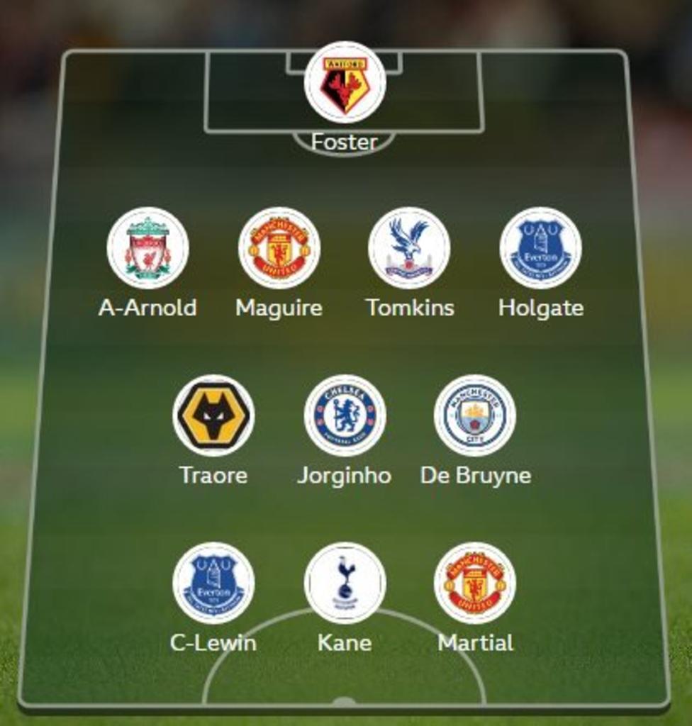 BBC team of the week in full: Foster; A-Arnold, Maguire, Tomkins, Holgate; Traore, Jorginho, De Bruyne; C-Lewin, Kane, Martial.