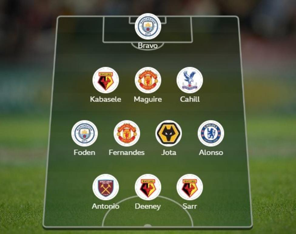Bravo; Kabasele, Maguire, Cahill; Foden, Fernandes, Jota, Alonso; Antonio, Deeney, Sarr.
