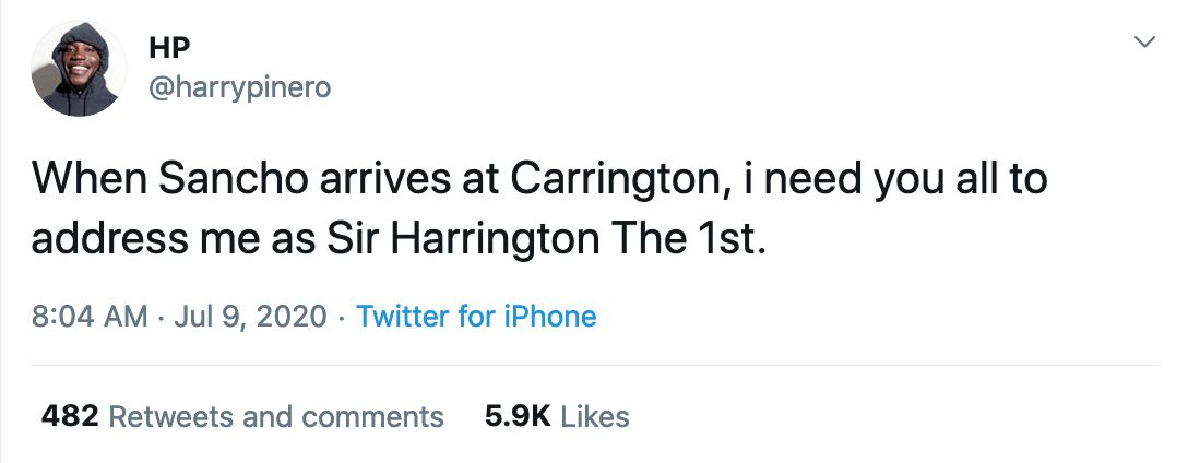 However, Harry Pinero’s Twitter activity has been brought to our attention because he claims United fans will have him to thank when Sancho makes the move to MUFC…