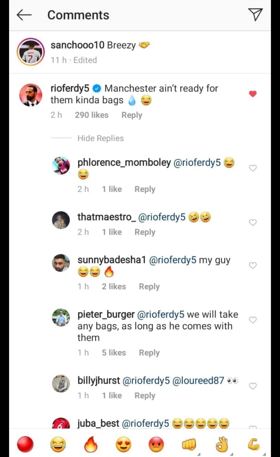 In his latest social media post, Sancho has posted a photo of himself wearing some questionable fashion accessories and ex-United centre-back and all round joker Ferdinand didn’t hang around to send an hilarious reply to the youngster.