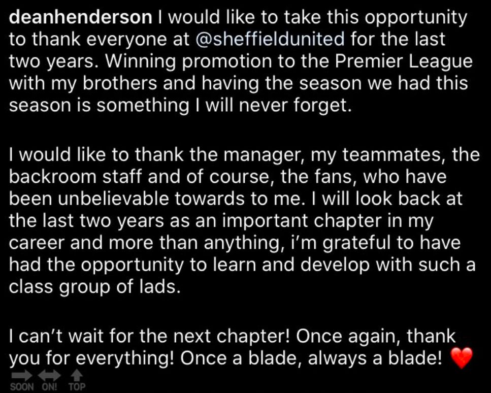 Henderson’s message plus the news of Ramsdale’s transfer makes the goalkeeper’s short-term future slightly clearer as he won’t be spending a third season out on loan at Bramall Lane.