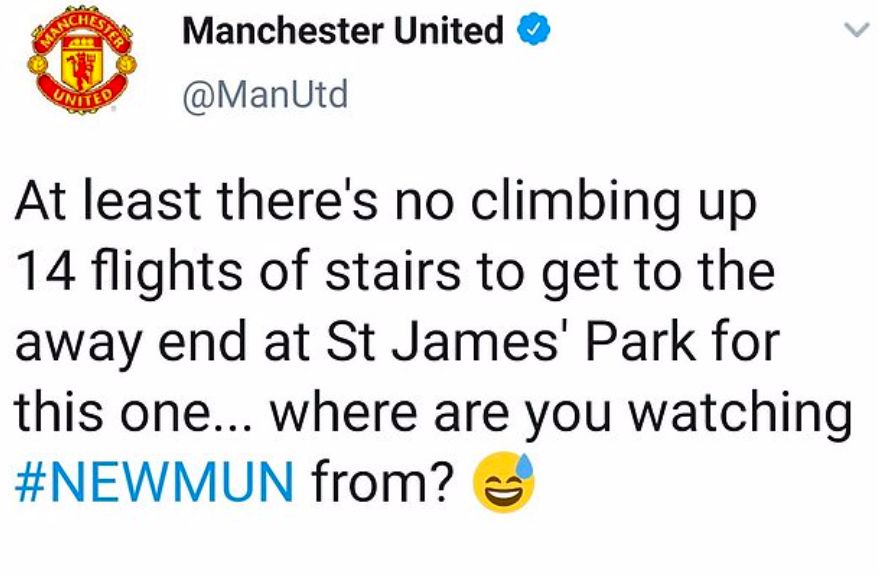 “At least there’s no climbing up 14 flights of stairs to get to the away end at St James’ Park for this one… where are you watching #NEWMUN from?,” the tweet read, aimed as a joke in relation to the lengthy walk to the away end but clearly out-of-touch with fans who would make plenty of sacrifices to have been at the game.