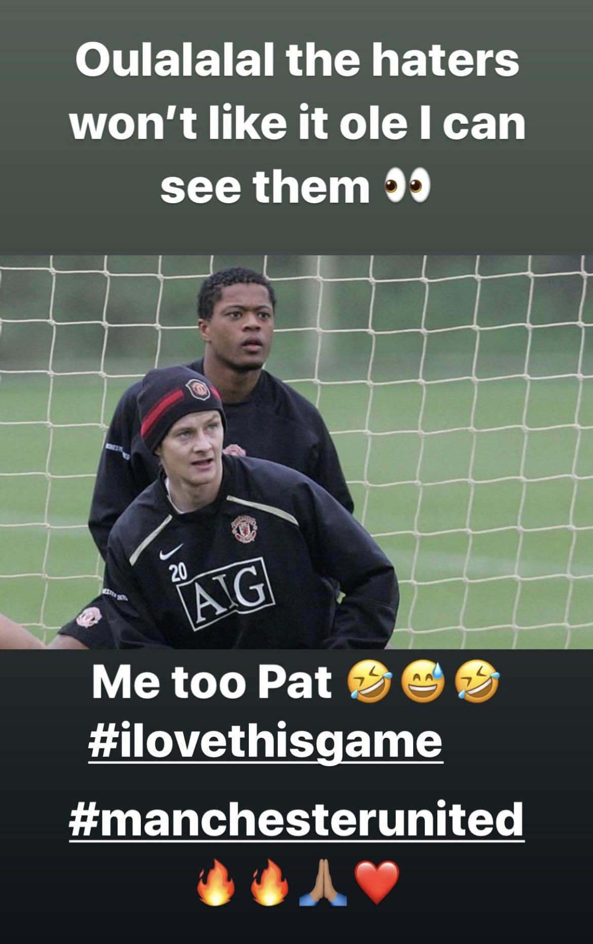 He added text to an old photo of Solskjaer and himself training at United which read: “Oulalalal the haters won’t like it Ole I can see them. Me too Pat #ilovethisgame #manchesterunited”