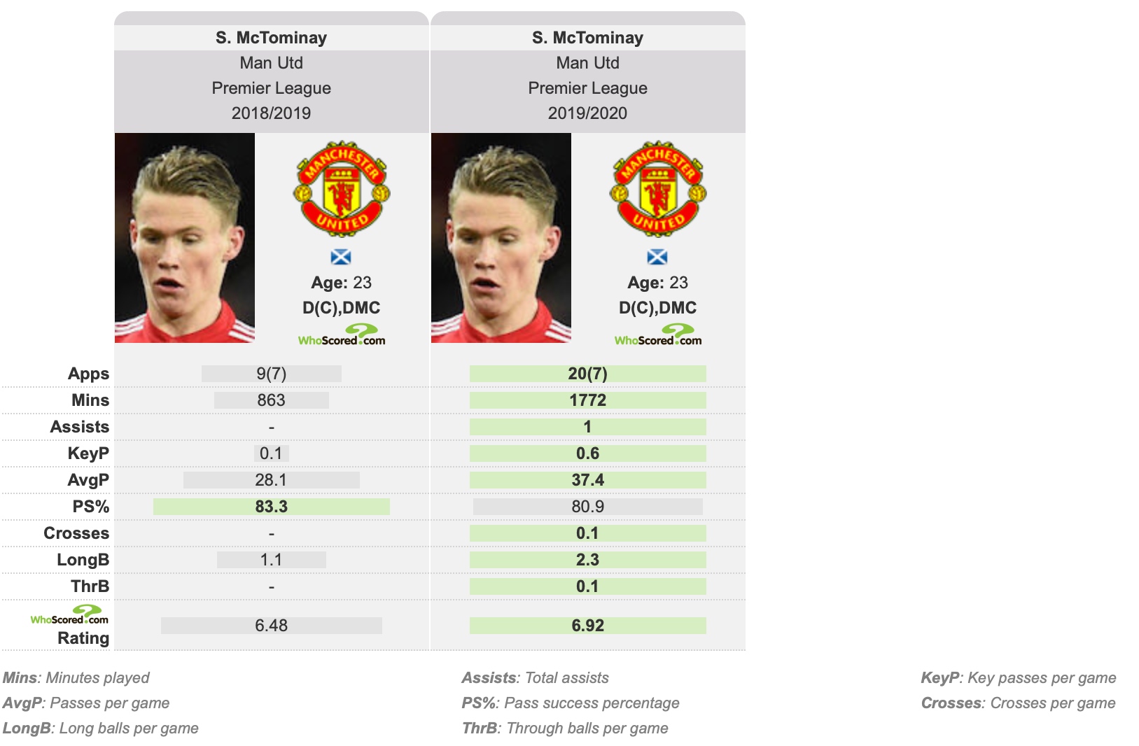 The 2018/19 season started as Mourinho unsuccessfully threw the Scotsman between CB and CM in multiple appearances before he was given his marching orders in December 2018. Under new boss Ole Gunnar Solskjaer, McTominay was awarded a new contract in January 2019, keeping him in Manchester until at least 2023. The Norwegian spoke highly of the Scotland international, stating: