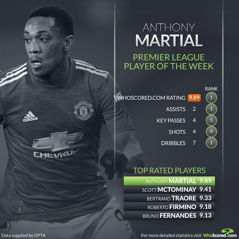 Anthony Martial has been named WhoScored’s Premier League Player of the Week.