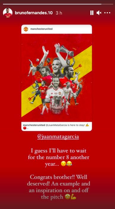 “I guess I’ll have to wait for the number 8 another year,” Bruno jokingly wrote in his story, as shown above. “Congrats brother! Well deserved! An example and an inspiration on and off the pitch.”
