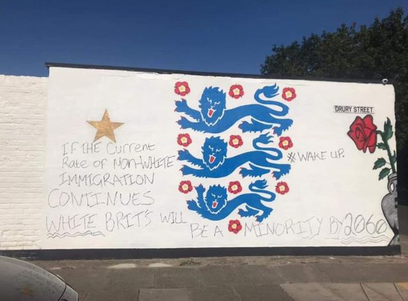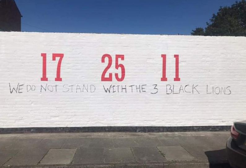 Images courtesy of the Daily Mirror show writing stating “we will not stand with the 3 black lions” while other images contain anti-immigration hate speech.