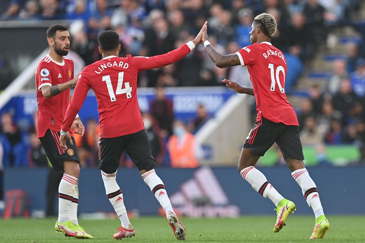 Manchester United's English striker Marcus Rashford (R) celebrates with Manchester United's English midfielder Jesse Lingard (L) after scoring their second goal during the English Premier League football match between Leicester City and Manchester United at King Power Stadium in Leicester, central England on October 16, 2021. - RESTRICTED TO EDITORIAL USE. No use with unauthorized audio, video, data, fixture lists, club/league logos or 'live' services. Online in-match use limited to 120 images. An additional 40 images may be used in extra time. No video emulation. Social media in-match use limited to 120 images. An additional 40 images may be used in extra time. No use in betting publications, games or single club/league/player publications. (Photo by Paul ELLIS / AFP) / RESTRICTED TO EDITORIAL USE. No use with unauthorized audio, video, data, fixture lists, club/league logos or 'live' services. Online in-match use limited to 120 images. An additional 40 images may be used in extra time. No video emulation. Social media in-match use limited to 120 images. An additional 40 images may be used in extra time. No use in betting publications, games or single club/league/player publications. / RESTRICTED TO EDITORIAL USE. No use with unauthorized audio, video, data, fixture lists, club/league logos or 'live' services. Online in-match use limited to 120 images. An additional 40 images may be used in extra time. No video emulation. Social media in-match use limited to 120 images. An additional 40 images may be used in extra time. No use in betting publications, games or single club/league/player publications. (Photo by PAUL ELLIS/AFP via Getty Images)